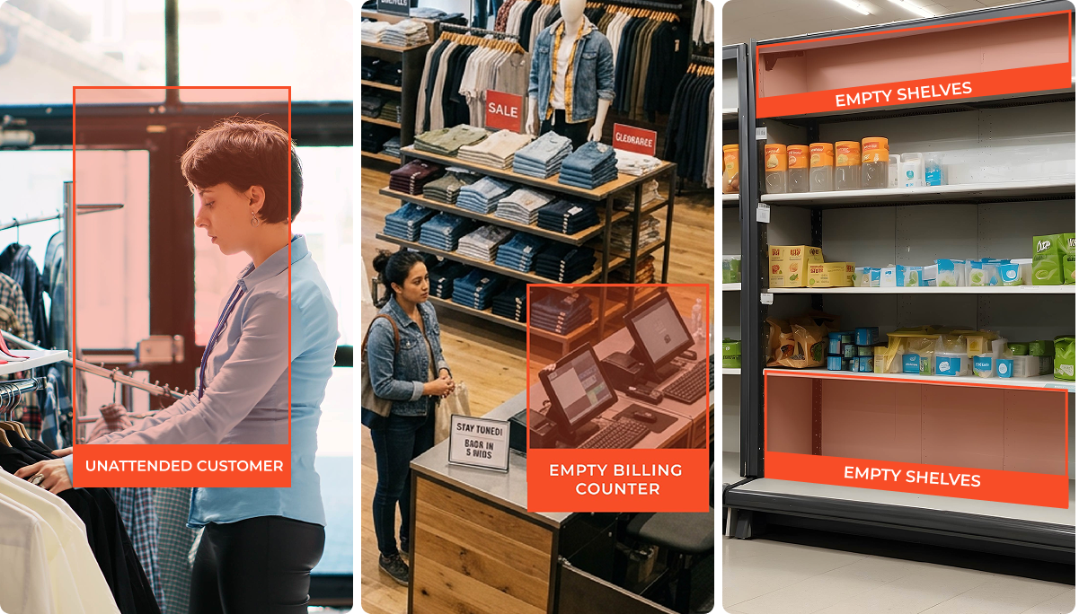 Ensure every customer interaction counts. Monitor unattended shoppers to reduce missed opportunities and churn, detect low or empty shelves with real-time restocking alerts, and track staff availability at counters to minimize wait times.